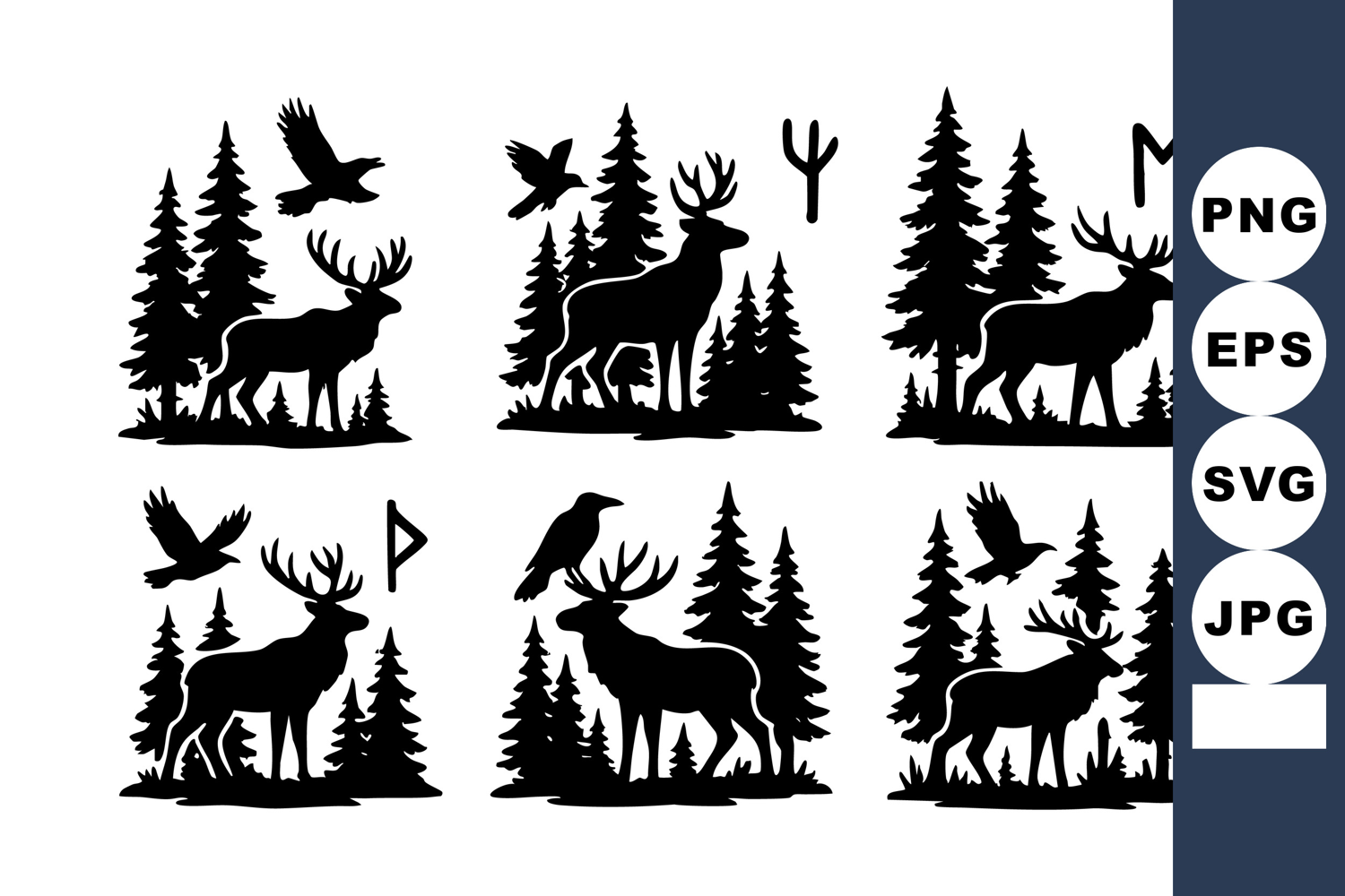 Deer silhouettes with forest trees and birds in nature wildl example image 1