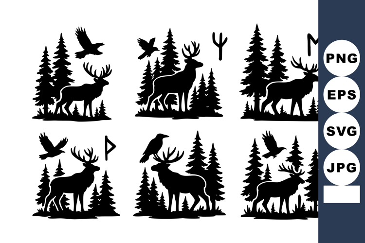 This vector set features six black silhouettes of deer, pine trees, and various birds, illustrating serene wildlife scenes in natural forest settings. Calm and peaceful mood.