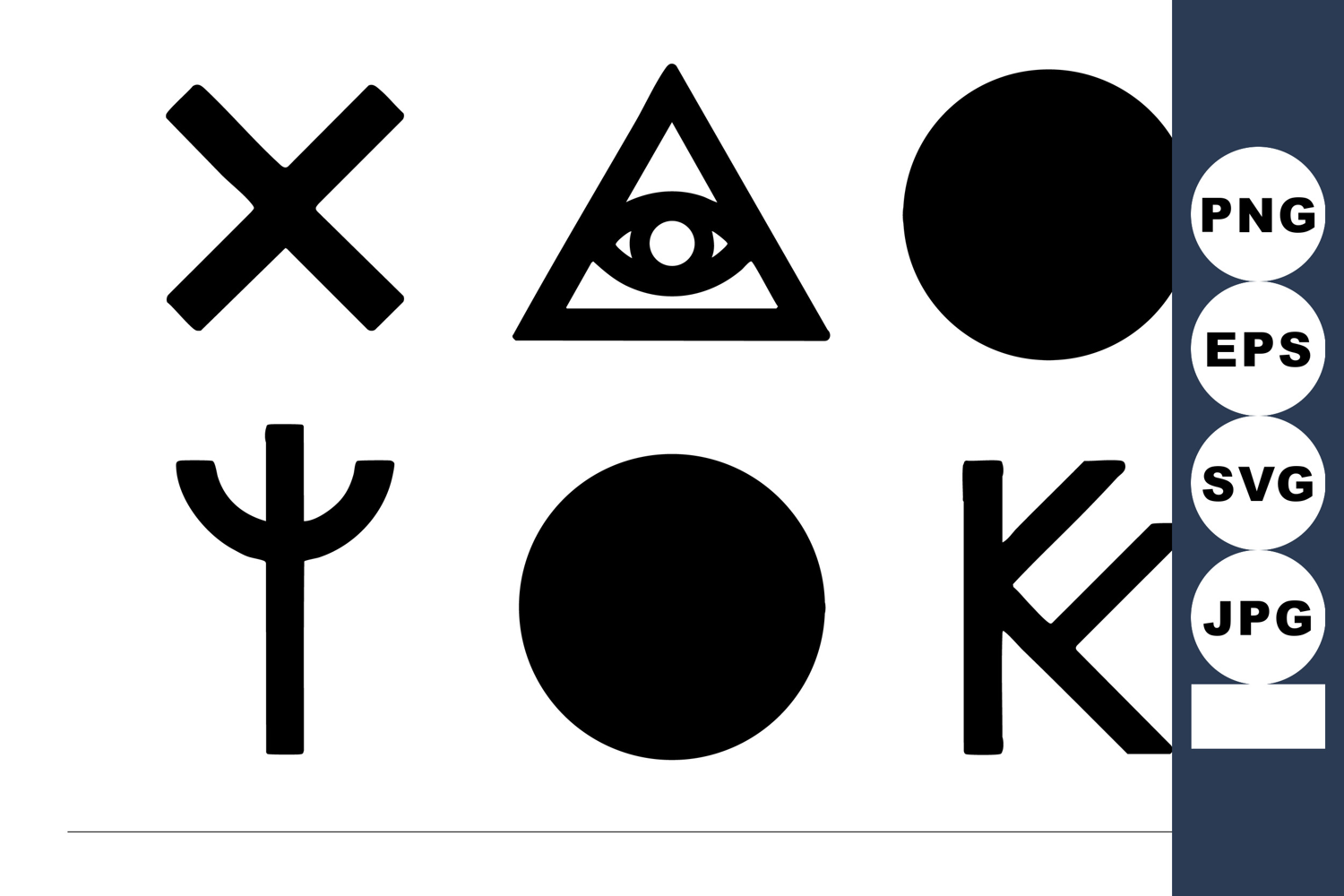 This vector file features six distinct black geometric symbols arranged in two rows, offering a minimalist and abstract style for design and artistic projects, evoking mystery and intrigue.