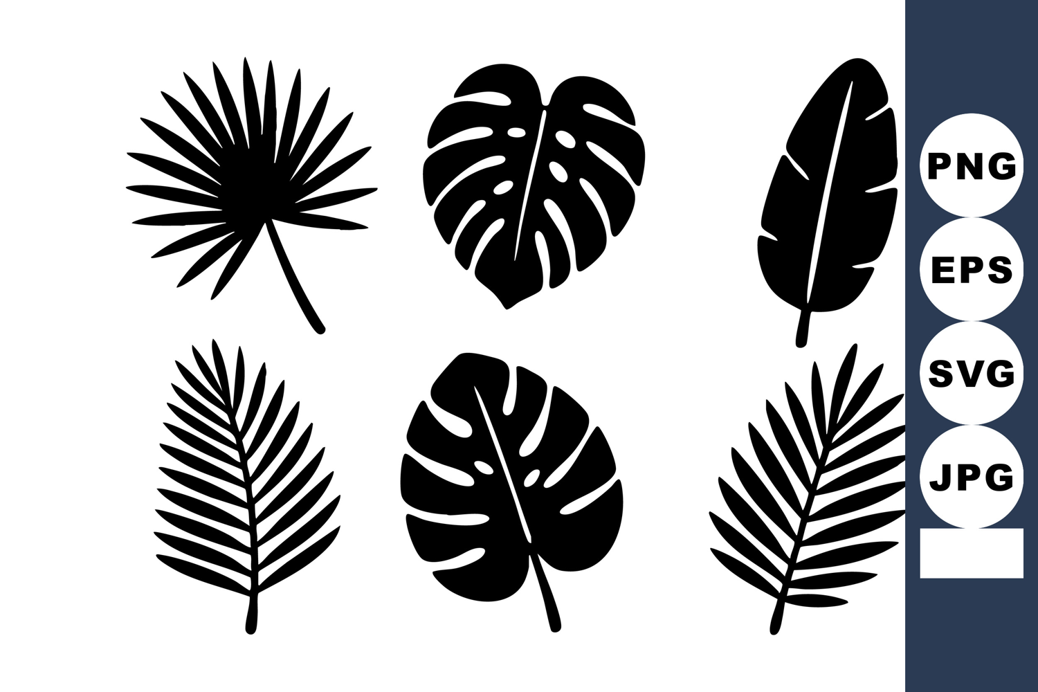 This vector set presents black silhouettes of tropical palm and monstera leaves in various shapes, perfect for decoration and design work, offering a bold and natural aesthetic.