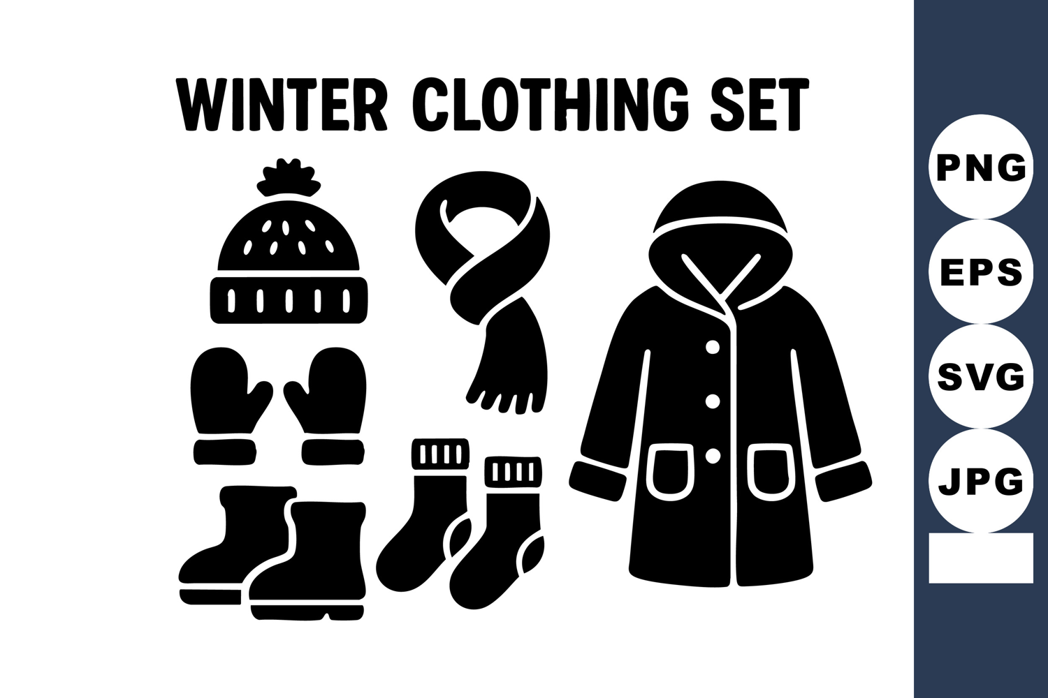 This vector shows a winter clothing set with mittens, scarf, boots, socks, and a hooded coat, designed for cold weather protection and warmth. Simple black silhouette style, practical and cozy. Calm mood.