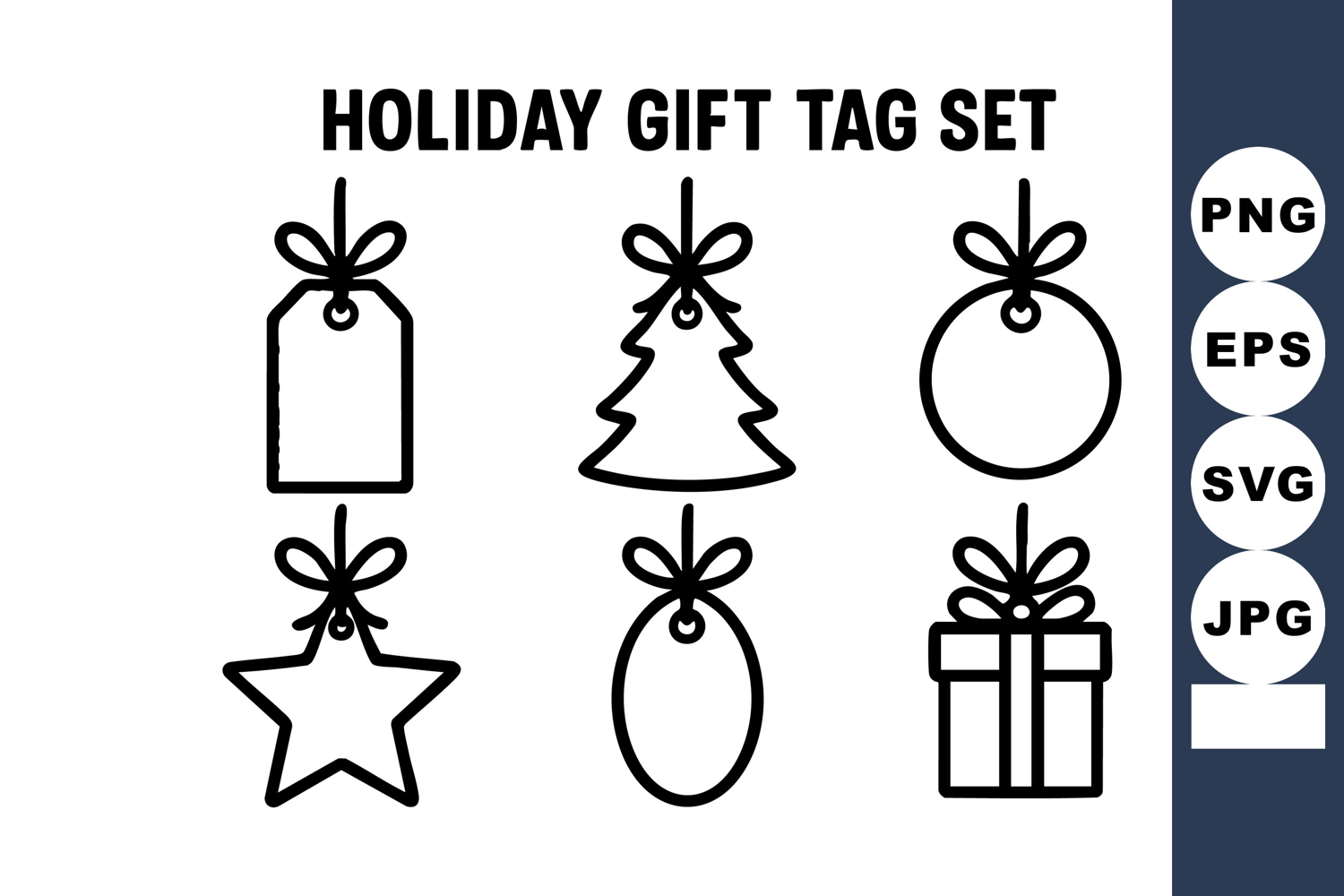 This vector features a holiday gift tag set with simple black line art shapes including star, tree, ball, egg, and present with bows, evoking festive and cheerful mood.