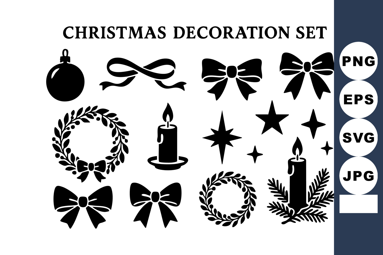 Vector features Christmas decorations including wreaths, candles, stars, bows, and baubles in black silhouette style for festive design projects and seasonal celebrations. Cheerful.