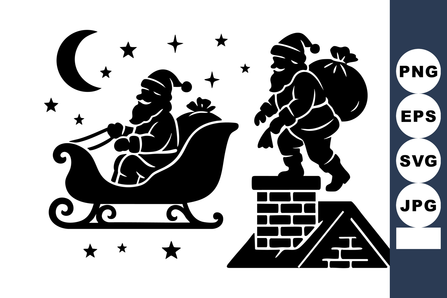 This vector depicts Santa Claus in silhouette style flying a sleigh and climbing a chimney with a gift sack under a crescent moon and stars. Festive and whimsical mood.