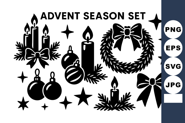 Black and white vector set featuring advent candles, Christmas wreath, decorative bows, and festive stars. Perfect for holiday season design projects. Cheerful and festive mood.