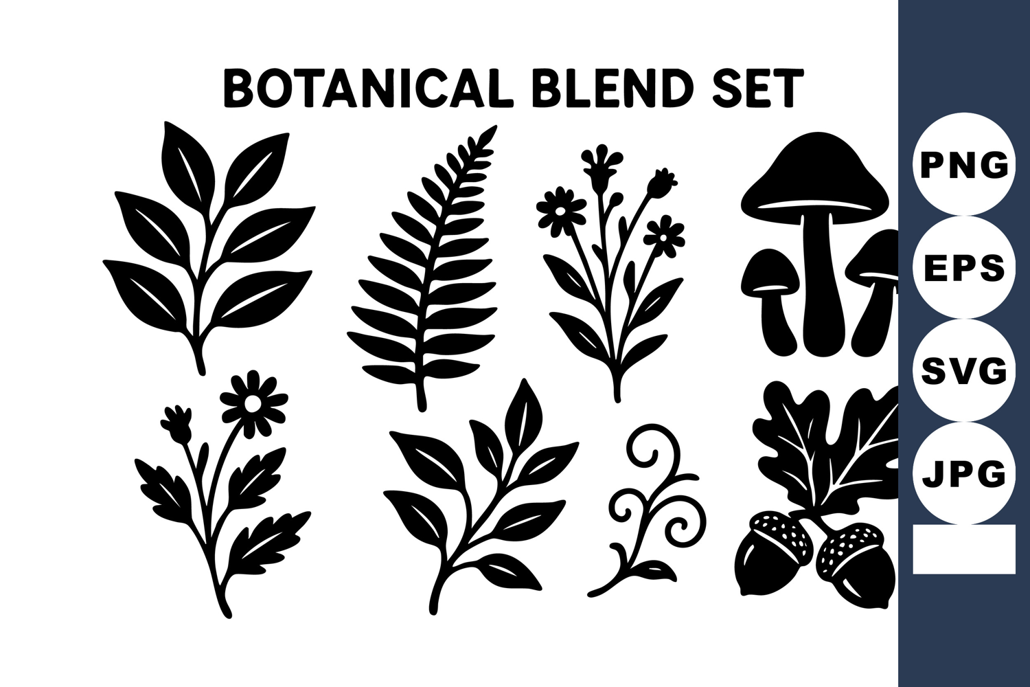 Black silhouette botanical blend set features leaves, fern, flowers, mushrooms, and acorns in a natural style. Perfect for nature-themed design projects. Simple and elegant mood.