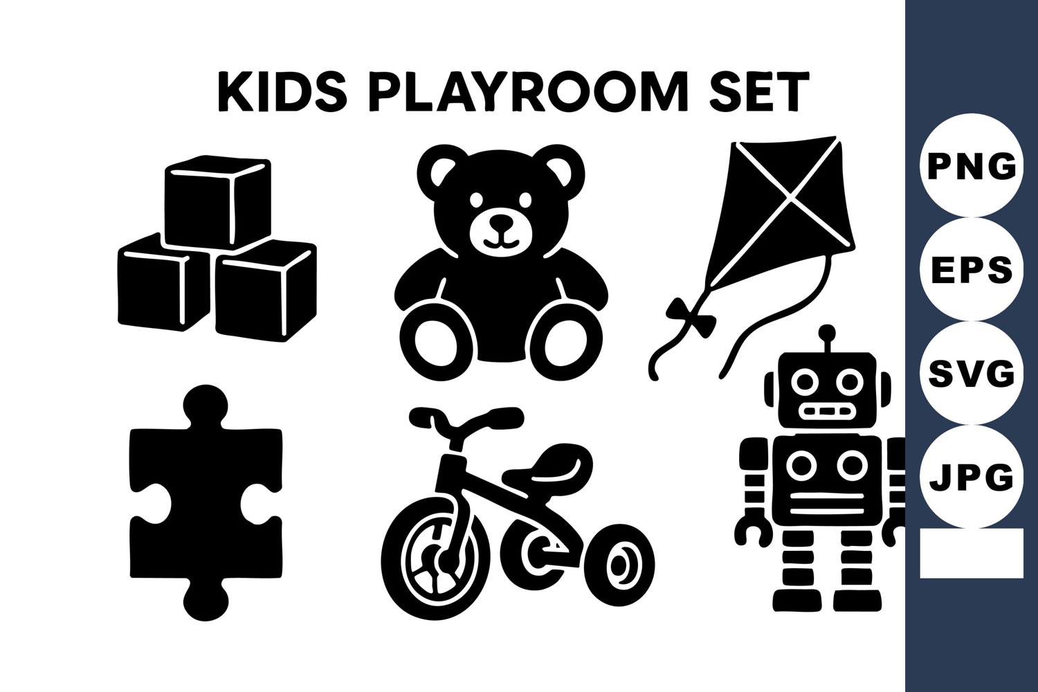 Black and white vector image showing a kids playroom set including teddy bear, blocks, kite, puzzle piece, tricycle, and robot toy, creating a playful and fun atmosphere. Cheerful.
