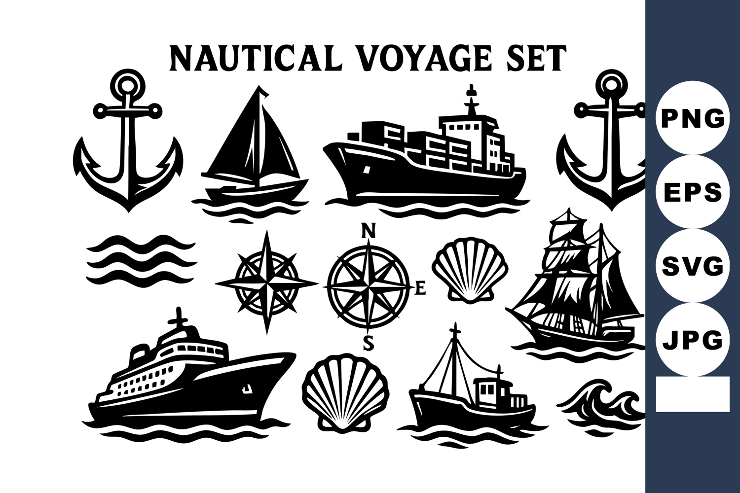 This nautical voyage set features sailing ships, anchors, compasses, seashells, waves, and cruise ships in a bold black vector style, evoking maritime adventure and exploration mood.