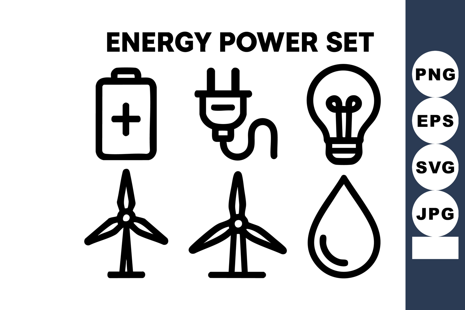 This vector image presents a simple black line energy power set including battery, plug, light bulb, wind turbines, and water drop icons in clean style, clear and minimalistic mood.