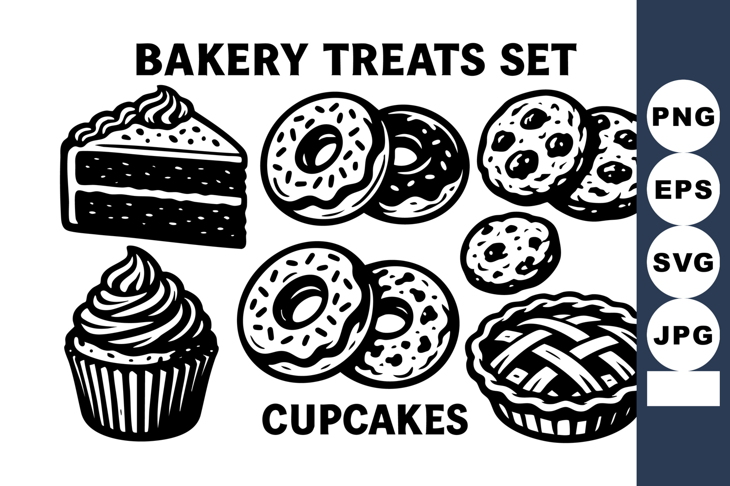 This vector features a black and white bakery treats set including cupcakes, cookies, donuts, pie, and cake, illustrated in a simple style. Classic and appetizing mood.