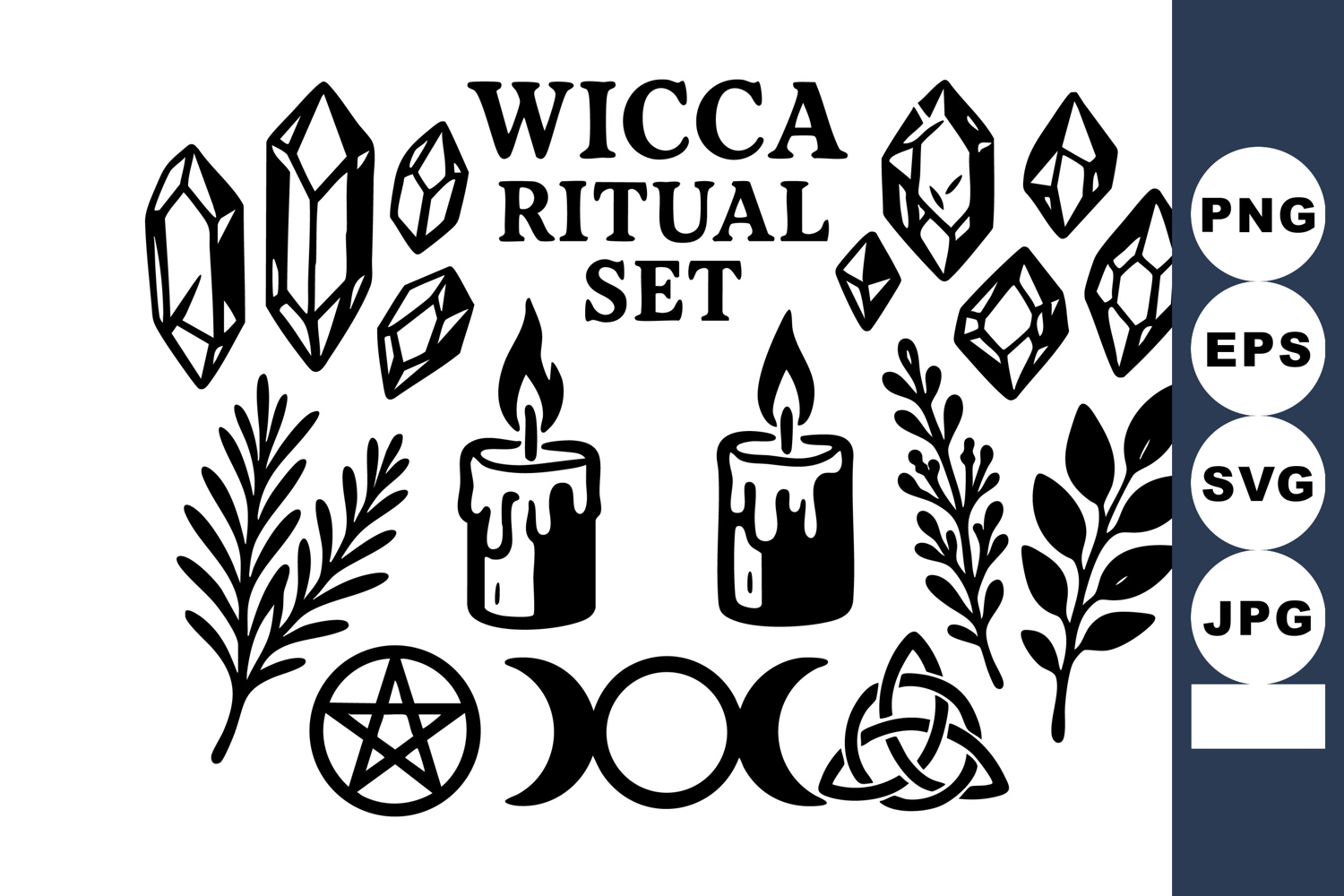 Black and white vector illustration of Wicca ritual set featuring crystals, candles, leaves, and pagan symbols for spiritual and witchcraft practices. Mystical and symbolic mood.
