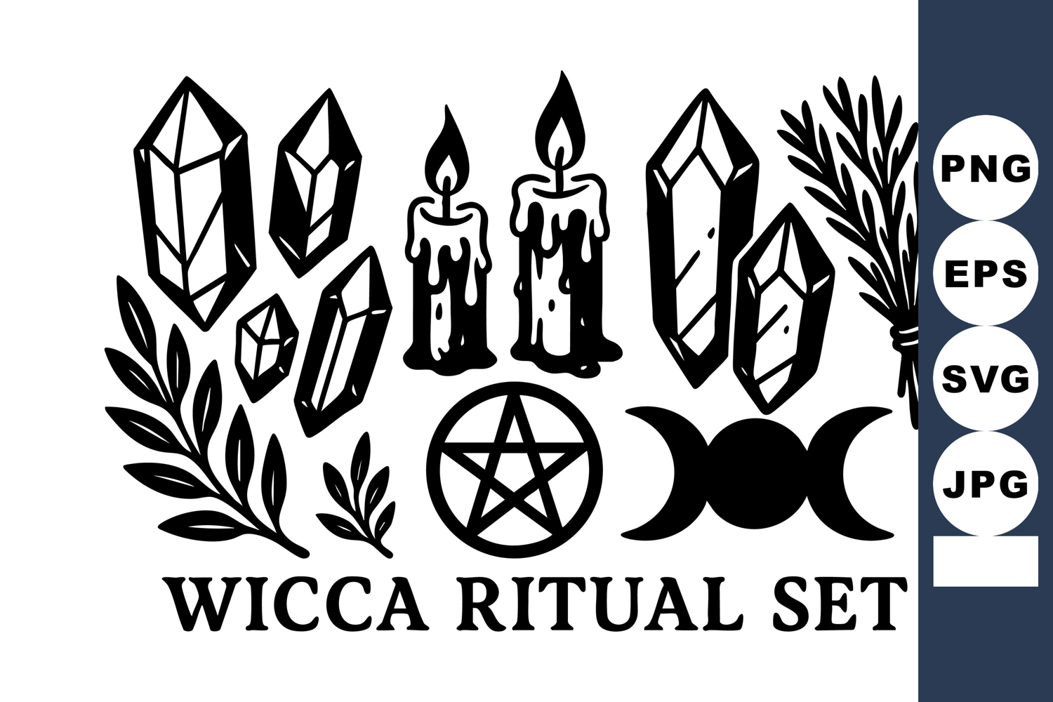 Black and white vector shows Wicca ritual set with candles, crystals, pentagram, and herbs arranged for spiritual magic practice, evoking mystical and sacred atmosphere.
