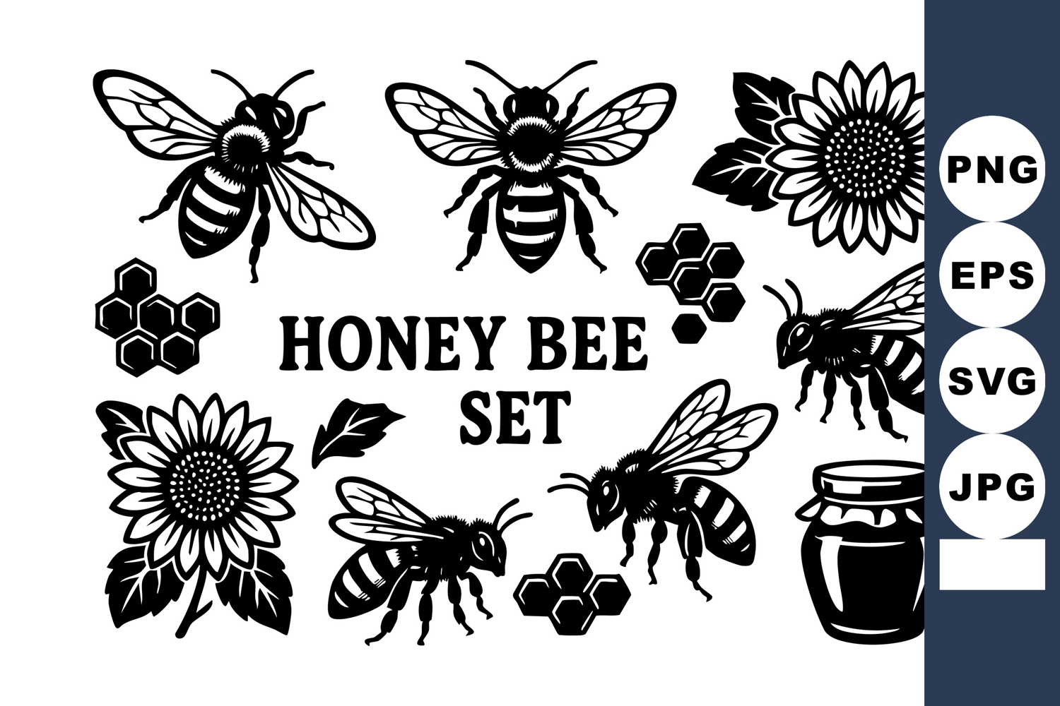 This vector features a honey bee set with detailed bees, sunflowers, honeycomb clusters, and a jar of honey in black and white, creating a classic and natural feel. Calm and vintage.