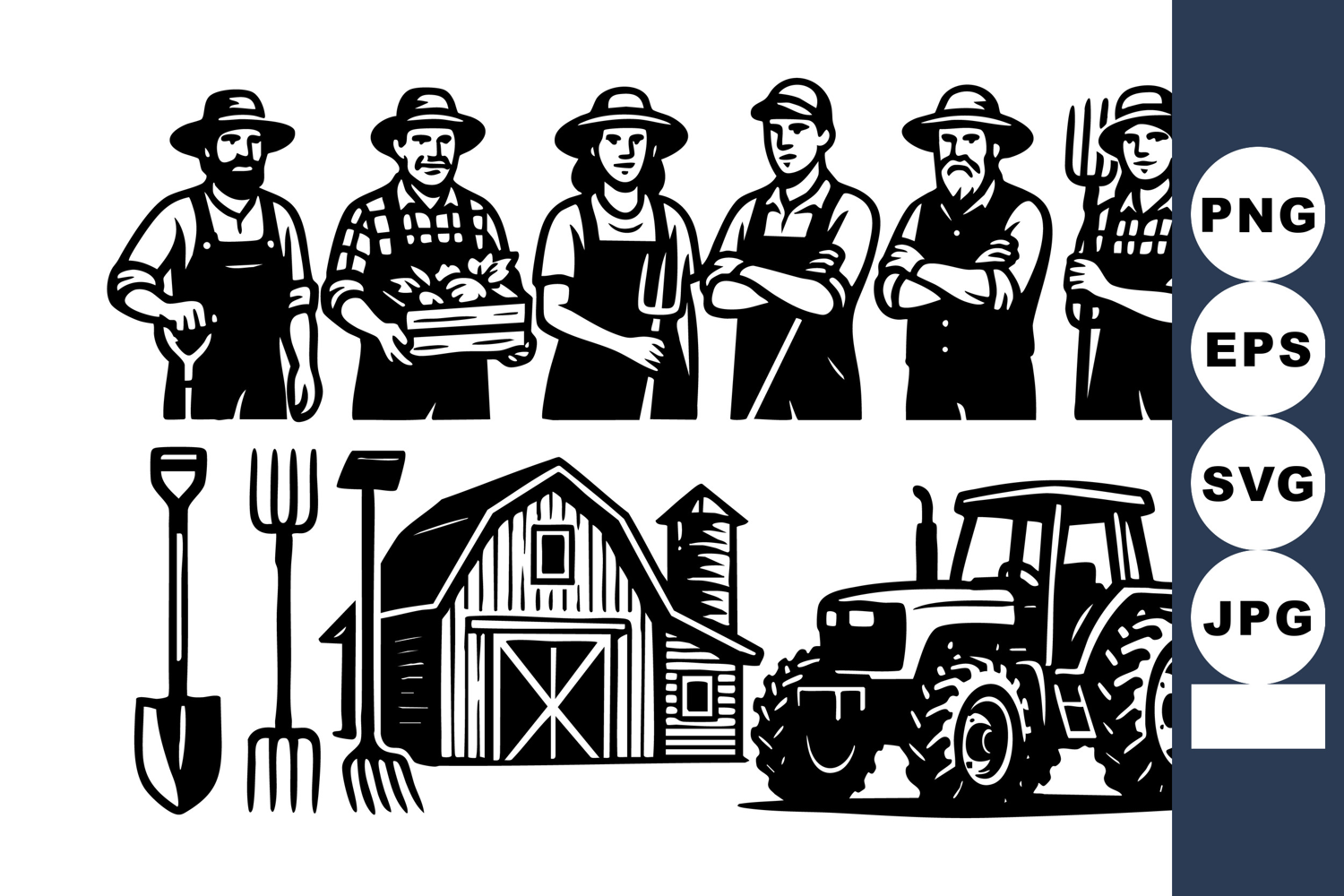 Group of six farmers standing confidently with farming tools, barn, and tractor in black and white vector style, representing rural agriculture and teamwork. Rustic and industrious mood.