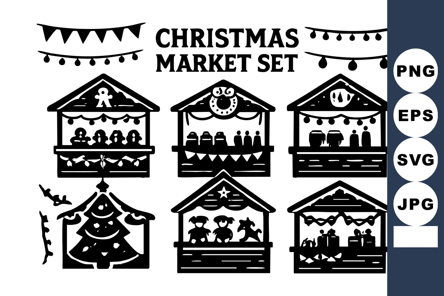 Black silhouette vector of six Christmas market stalls with decorations, lights, and festive items, perfect for winter holiday design projects, cheerful and seasonal mood.