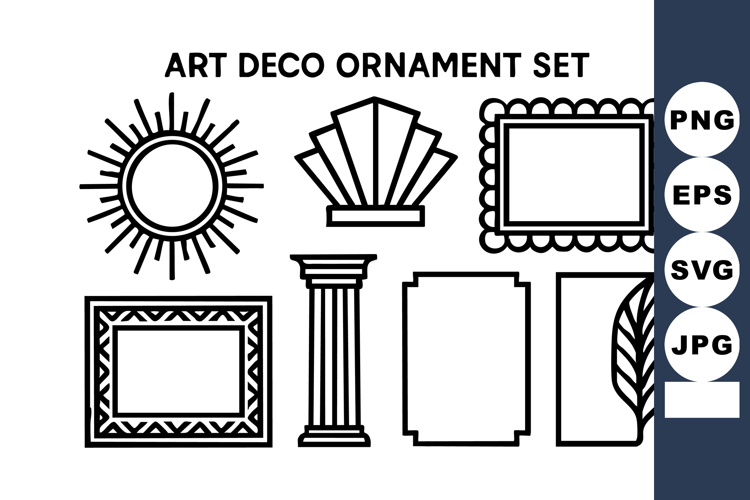 This vector art deco ornament set features geometric shapes, decorative frames, a column, and a feather motif in black line style. The design is elegant and vintage-inspired. Classic mood.
