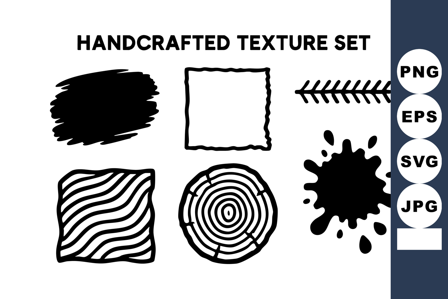 This vector set contains six handcrafted black ink textures including brush stroke, square outline, arrow, wavy lines, circular rings, and ink splash for creative use in design projects, artistic mood.