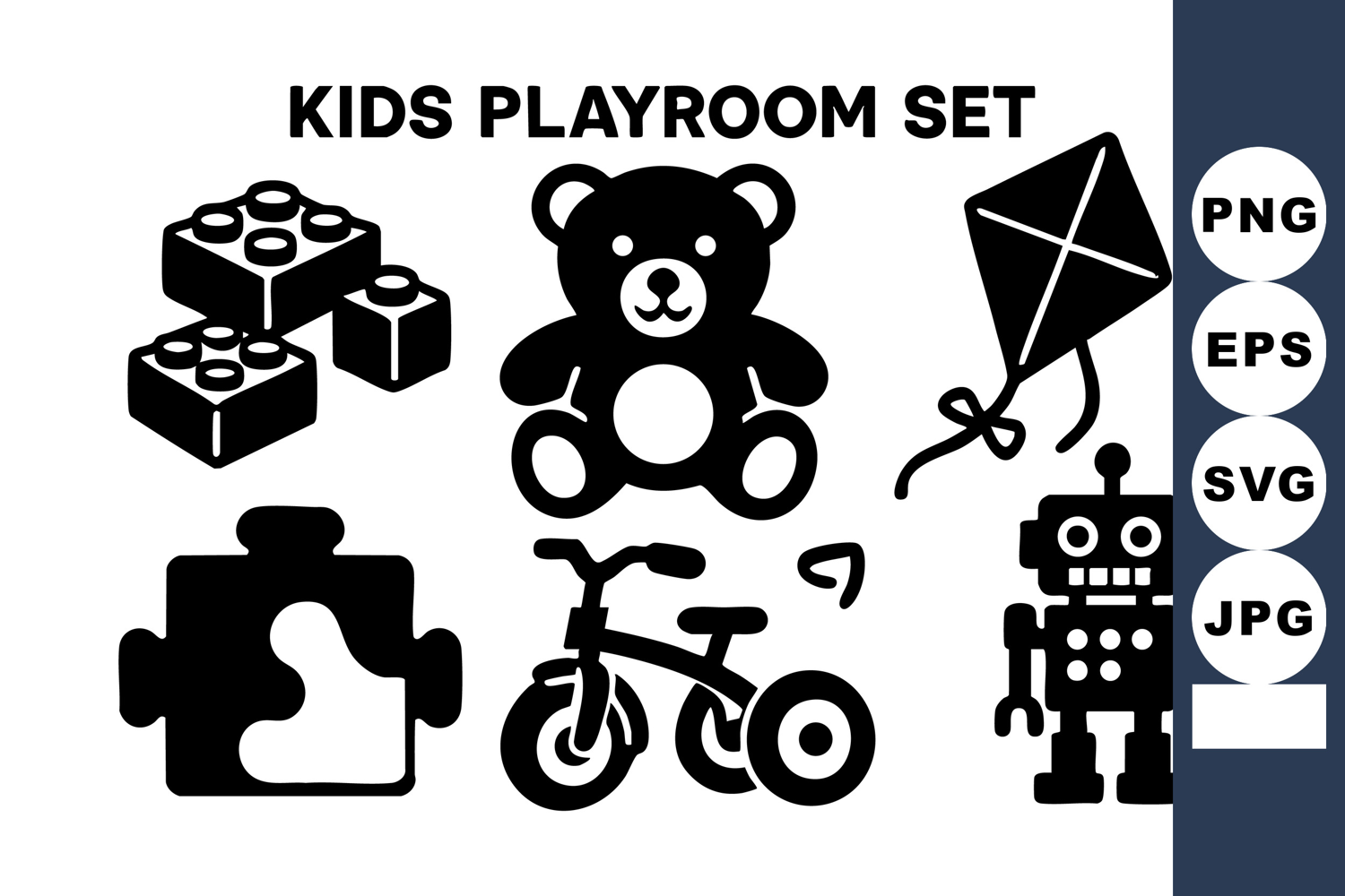This vector illustration shows a kids playroom set with various toy icons such as a teddy bear, kite, puzzle piece, robot, bicycle, and building blocks in black silhouette style. Cheerful mood.