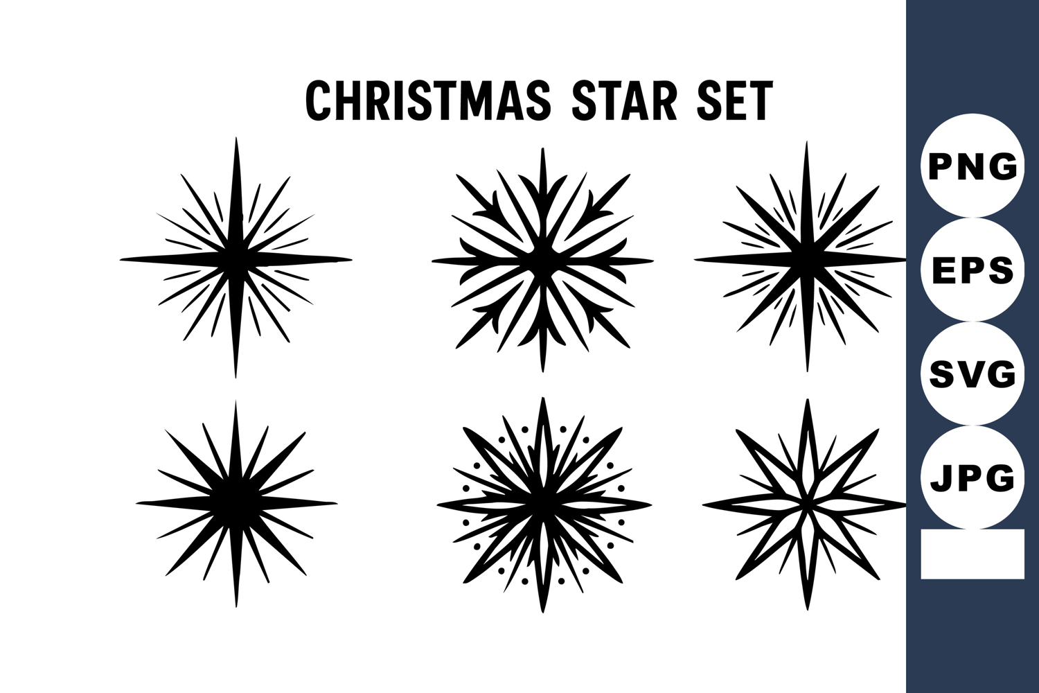 Six black Christmas star designs display vintage holiday decoration styles in vector format, perfect for festive graphic projects and seasonal themes, creating a classic and elegant mood.