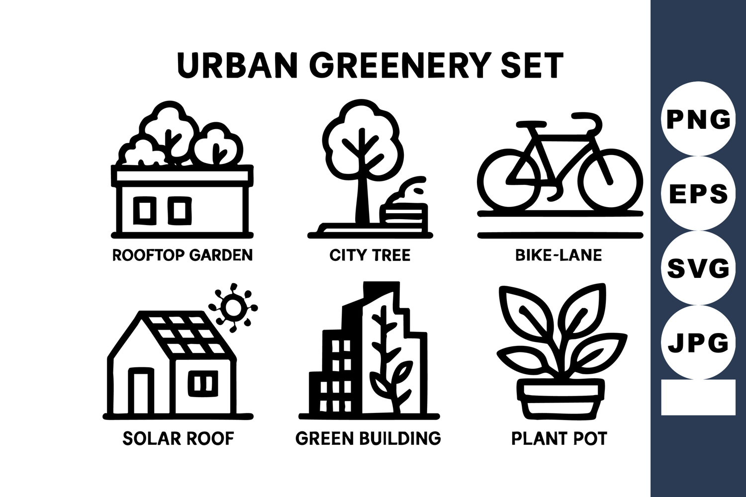 Vector icons present urban greenery concepts including rooftop garden, city tree, bike lane, solar roof, green building, and plant pot in a clean black line style, modern and eco-friendly mood.