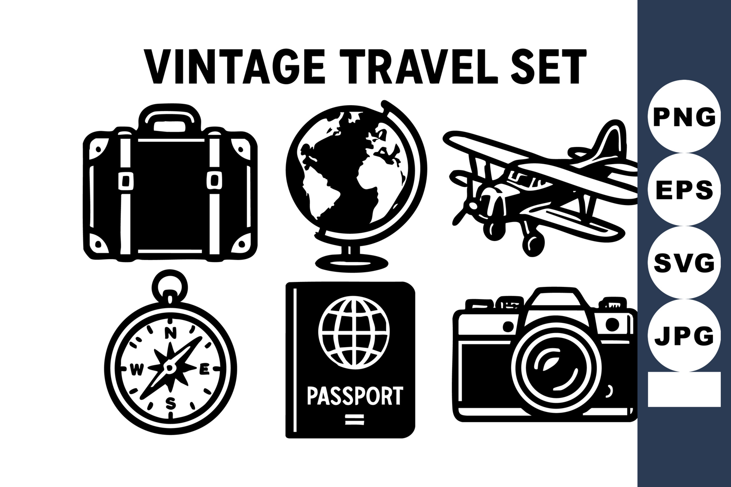 This vector features vintage travel icons including a suitcase, globe, airplane, compass, passport, and camera in black silhouette style, evoking nostalgic exploration and adventure vibes.