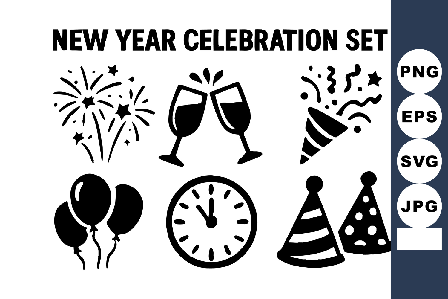 Black silhouette icons depict New Year celebration with fireworks, balloons, clock, party hats, and confetti. Festive and joyful mood.