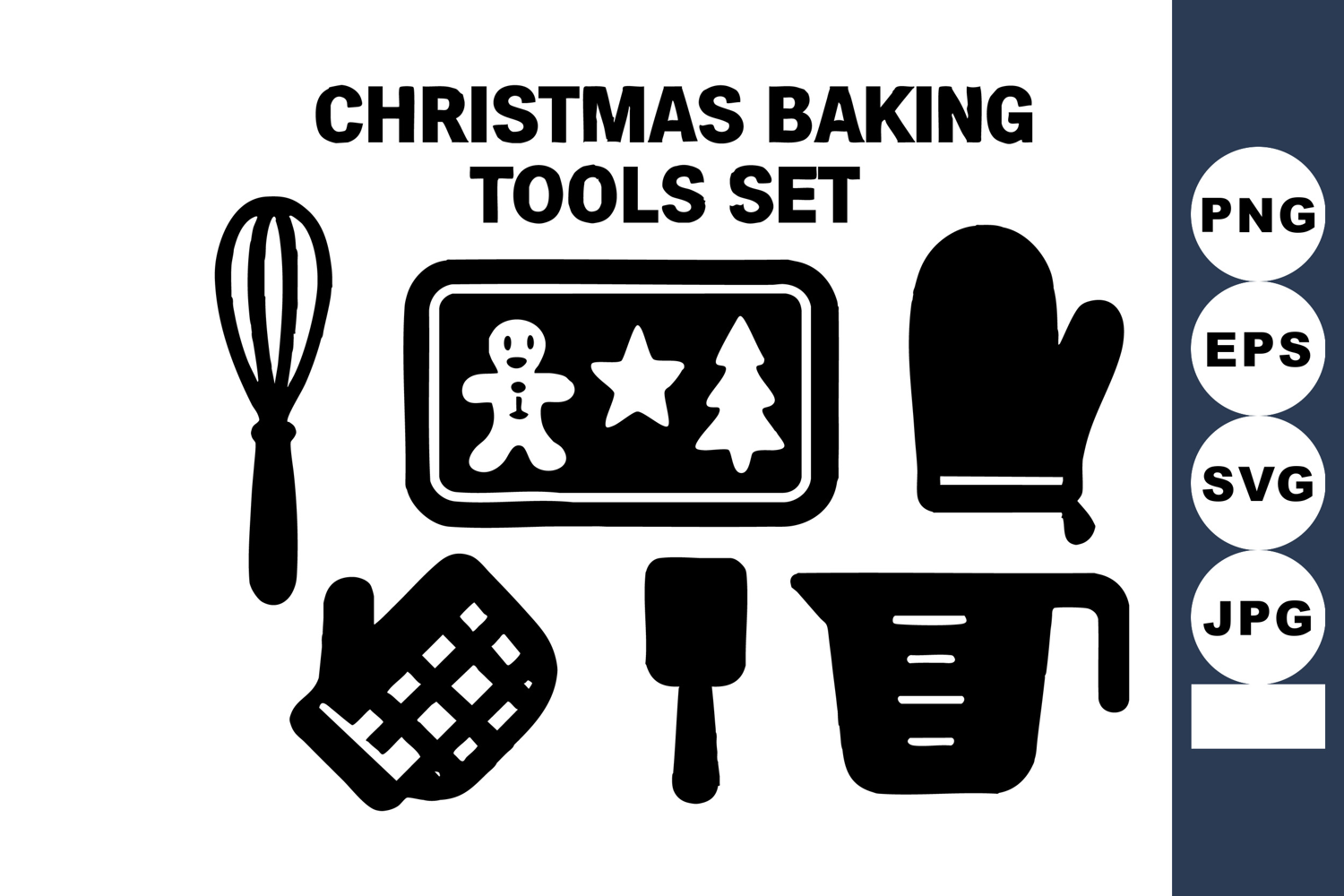 Vector illustration shows Christmas baking tools including whisk, oven mitt, spatula, measuring cup, and cookie tray with holiday shapes. Black silhouette style, festive mood.