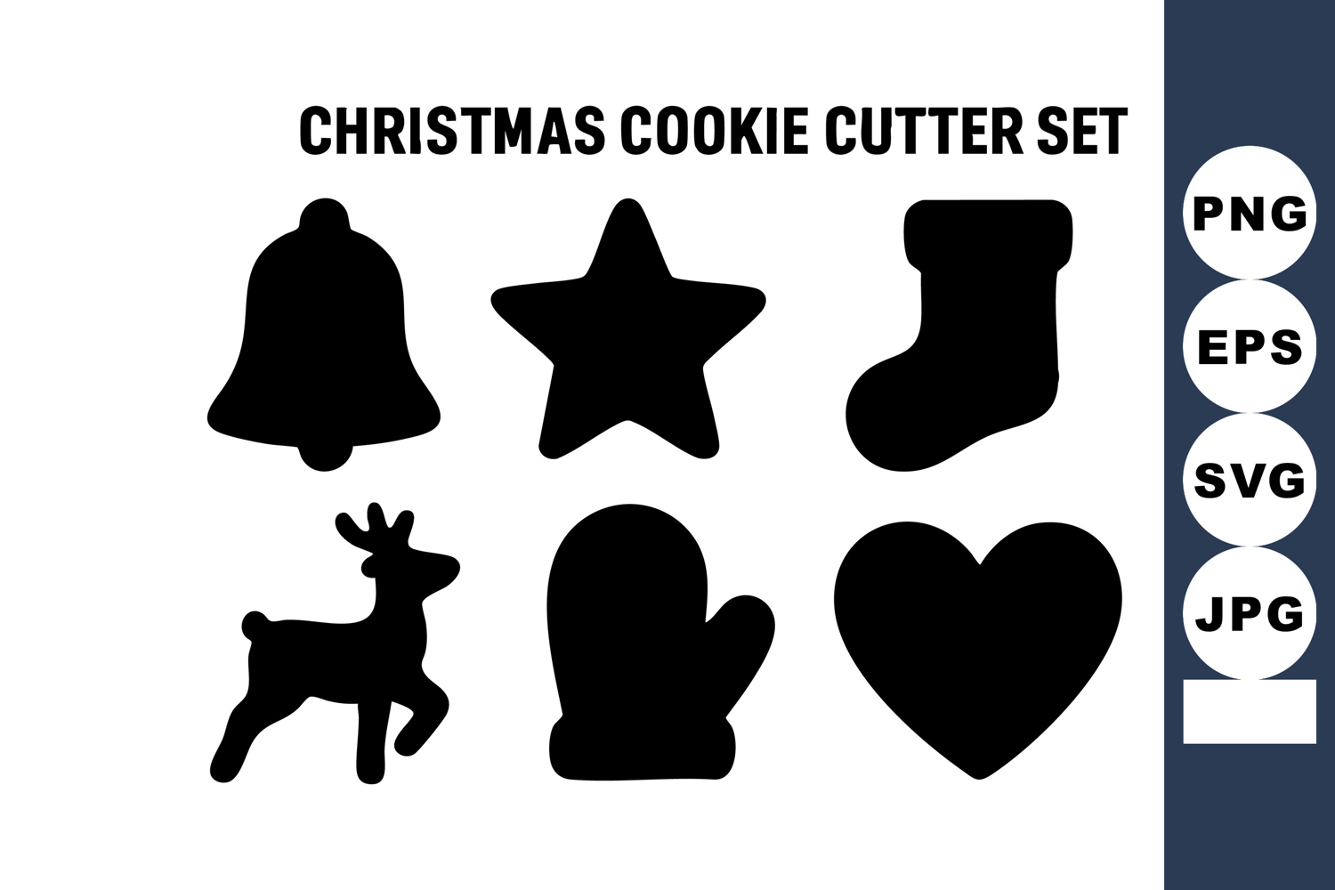 This vector features six black Christmas cookie cutter silhouettes including bell, star, stocking, reindeer, mitten, and heart shapes for holiday baking activities and seasonal creativity. Festive mood.