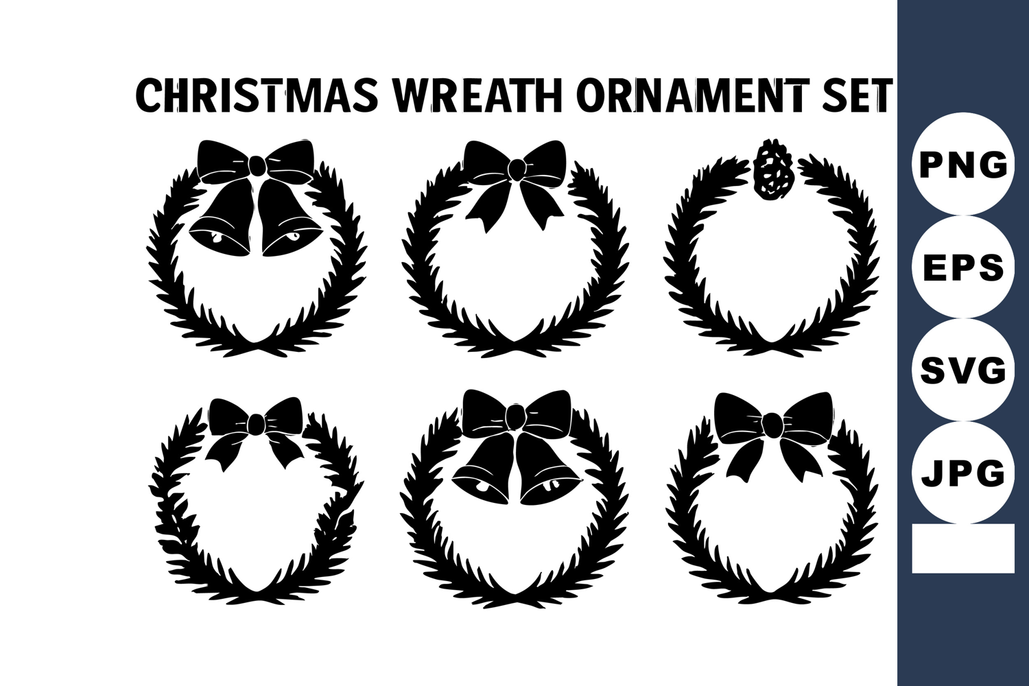 Set of six black silhouette Christmas wreath ornaments featuring bows, bells, and pinecones for festive holiday decoration in vector style. Classic and elegant mood.