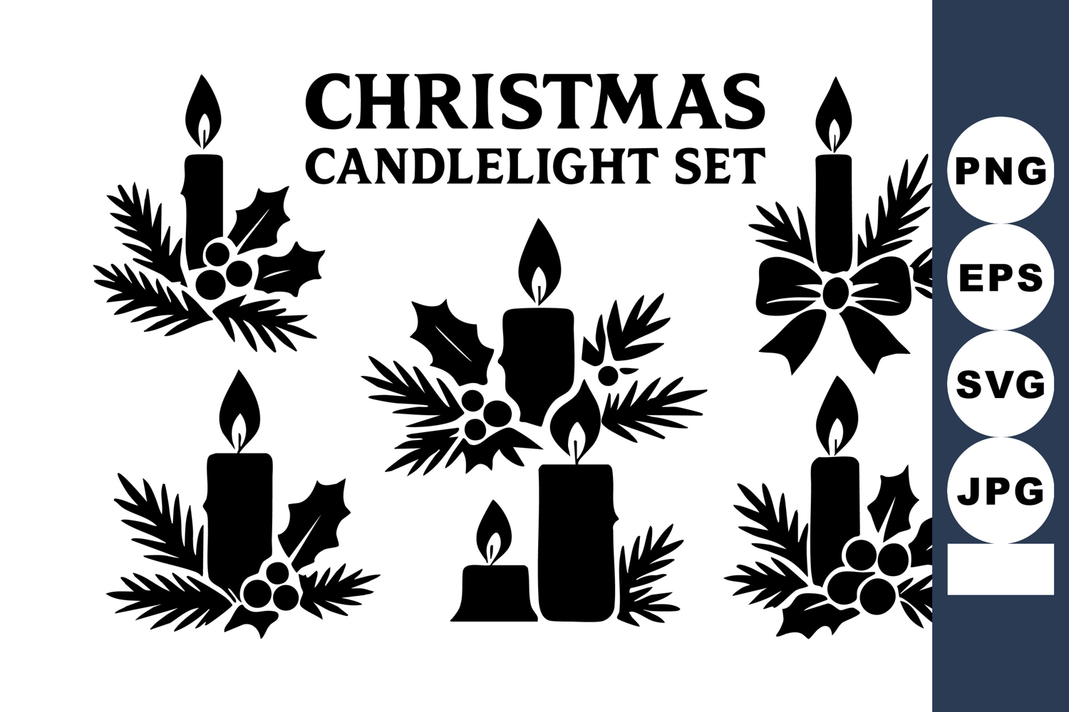 This vector features a collection of Christmas candlelight designs adorned with holly berries, pine needles, and festive bows, evoking a warm and traditional holiday atmosphere. Cheerful mood.