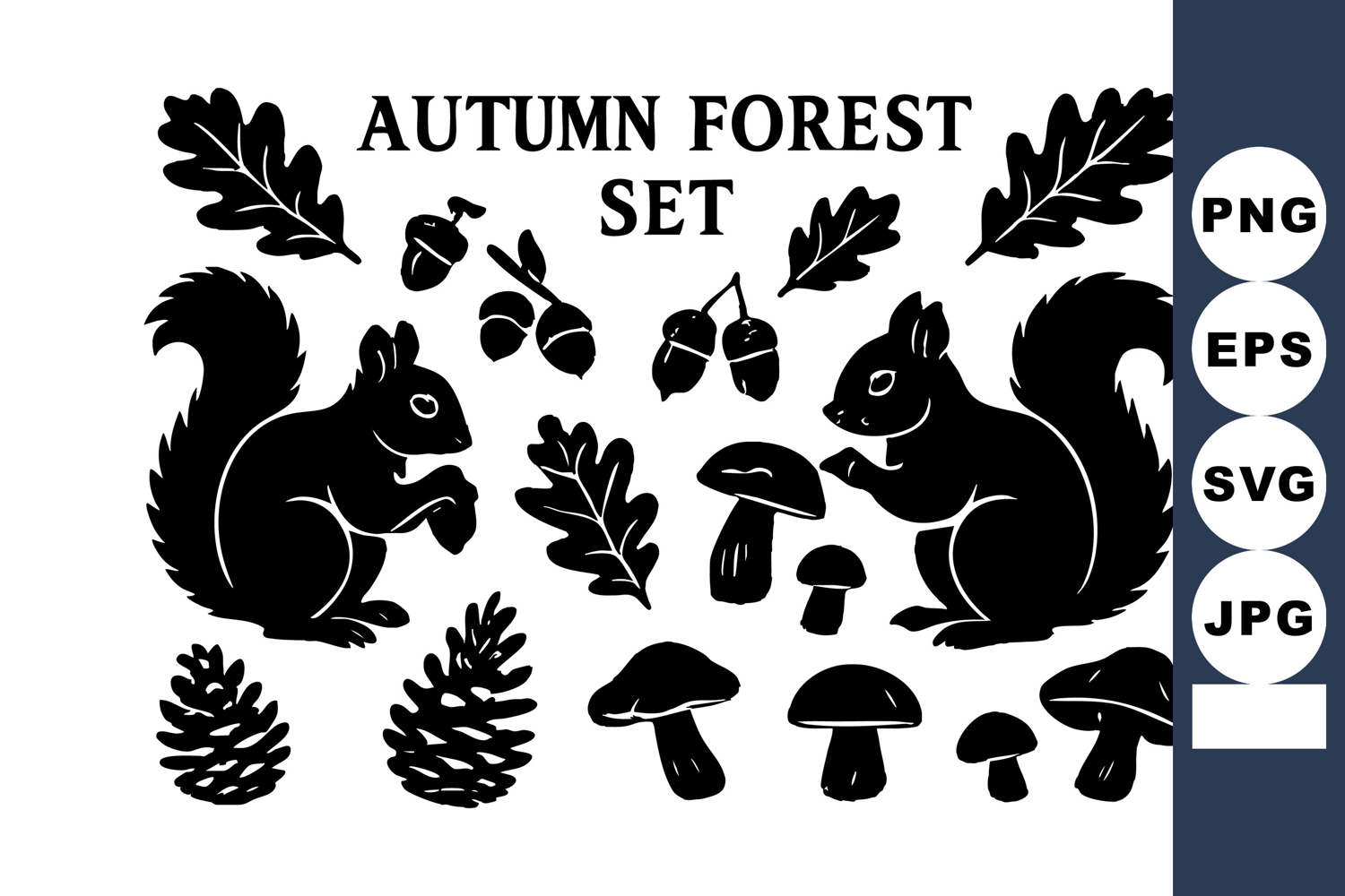 This vector set features autumn forest elements including squirrels, acorns, leaves, mushrooms, and pine cones in black silhouette style, perfect for seasonal woodland designs. Calm mood.