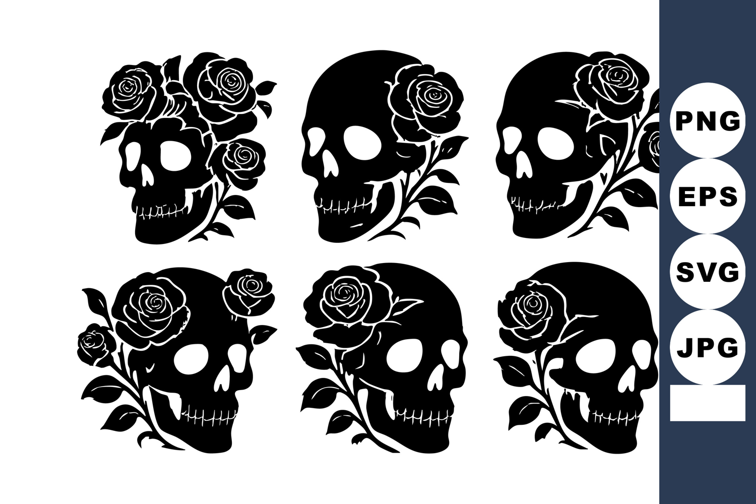 This vector presents six black skull silhouettes adorned with rose flowers in a minimalist black and white style, ideal for gothic or tattoo art projects, creating a dark and elegant mood.
