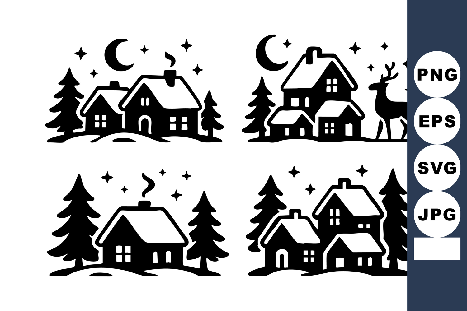 Vector illustrations depict cozy winter cabins surrounded by pine trees under crescent moons with stars and a deer silhouette, evoking peaceful and serene nighttime mood.
