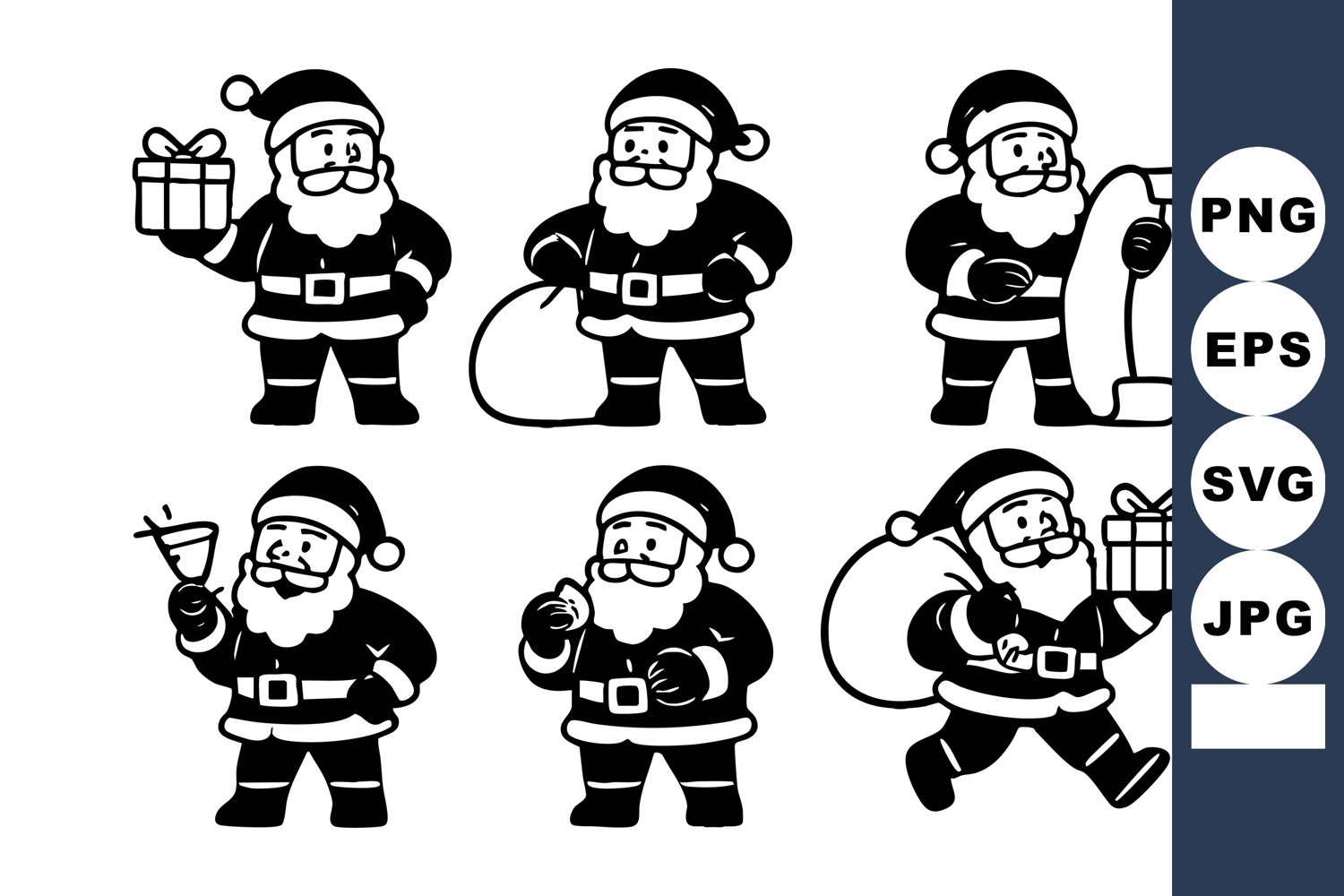 Santa Claus appears in six different poses holding gifts, a checklist, and a sack, representing Christmas holiday spirit in a cheerful, festive mood.