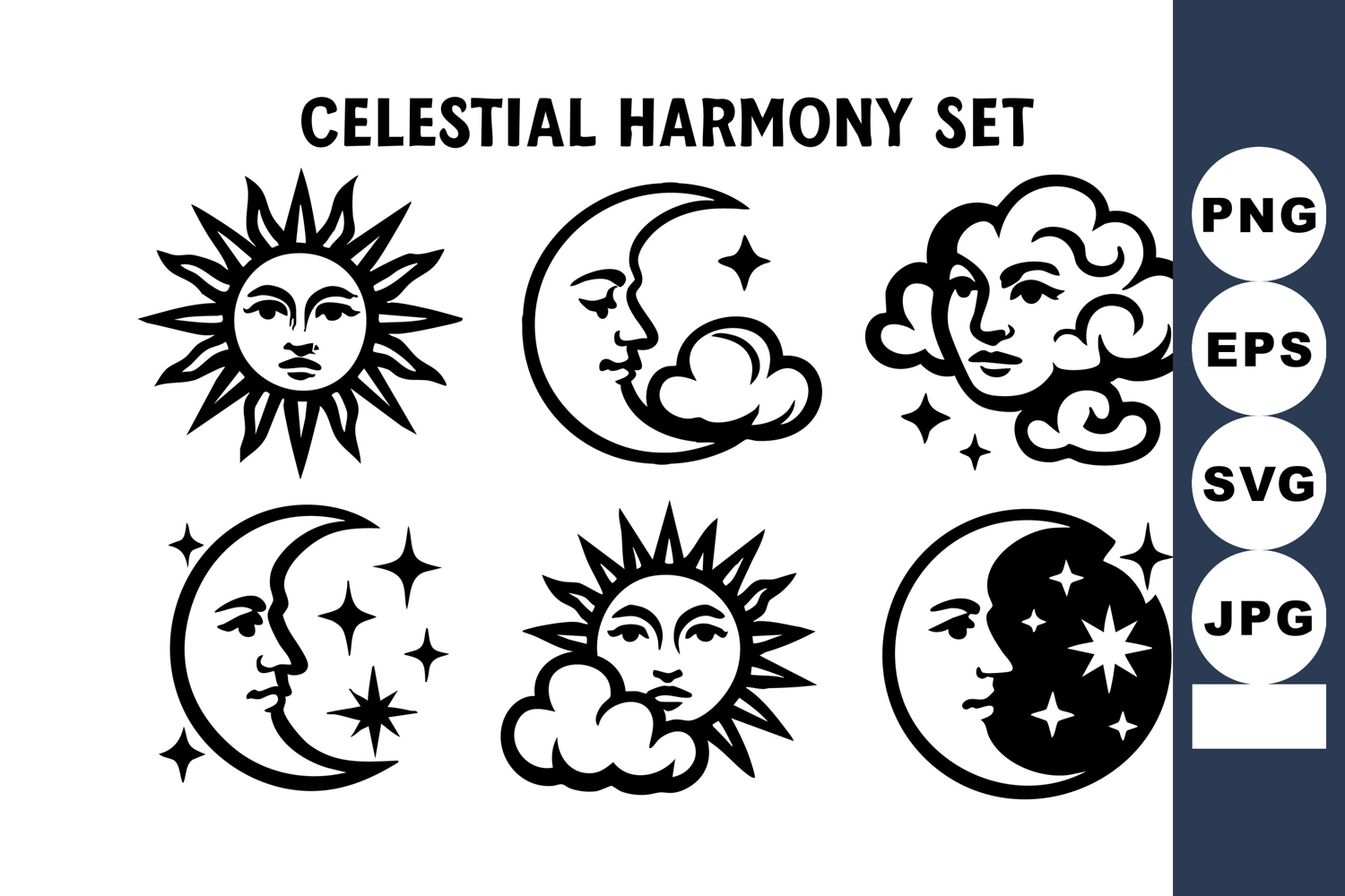 This vector set presents six celestial symbols featuring sun, moon, stars, and clouds in a vintage black and white style, evoking mystical and cosmic harmony. Mysterious and elegant mood.
