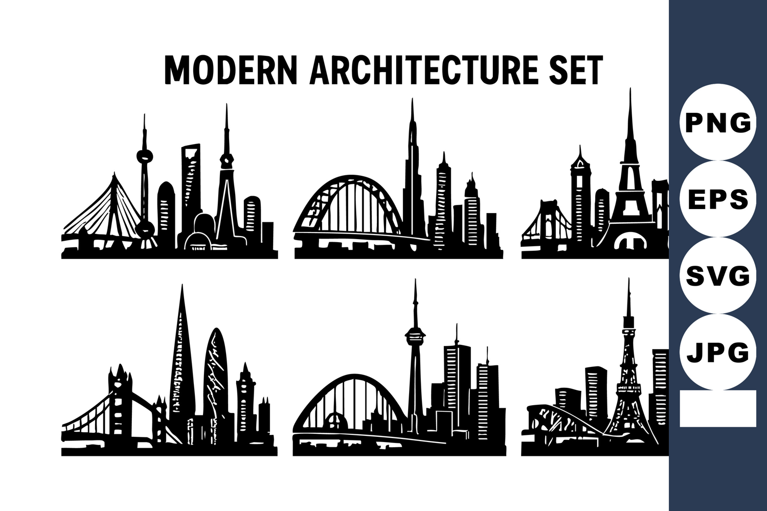 This vector file shows modern architecture silhouettes of various city skylines with bridges and towers in a clean black style. The design is minimalistic and professional. Calm mood.