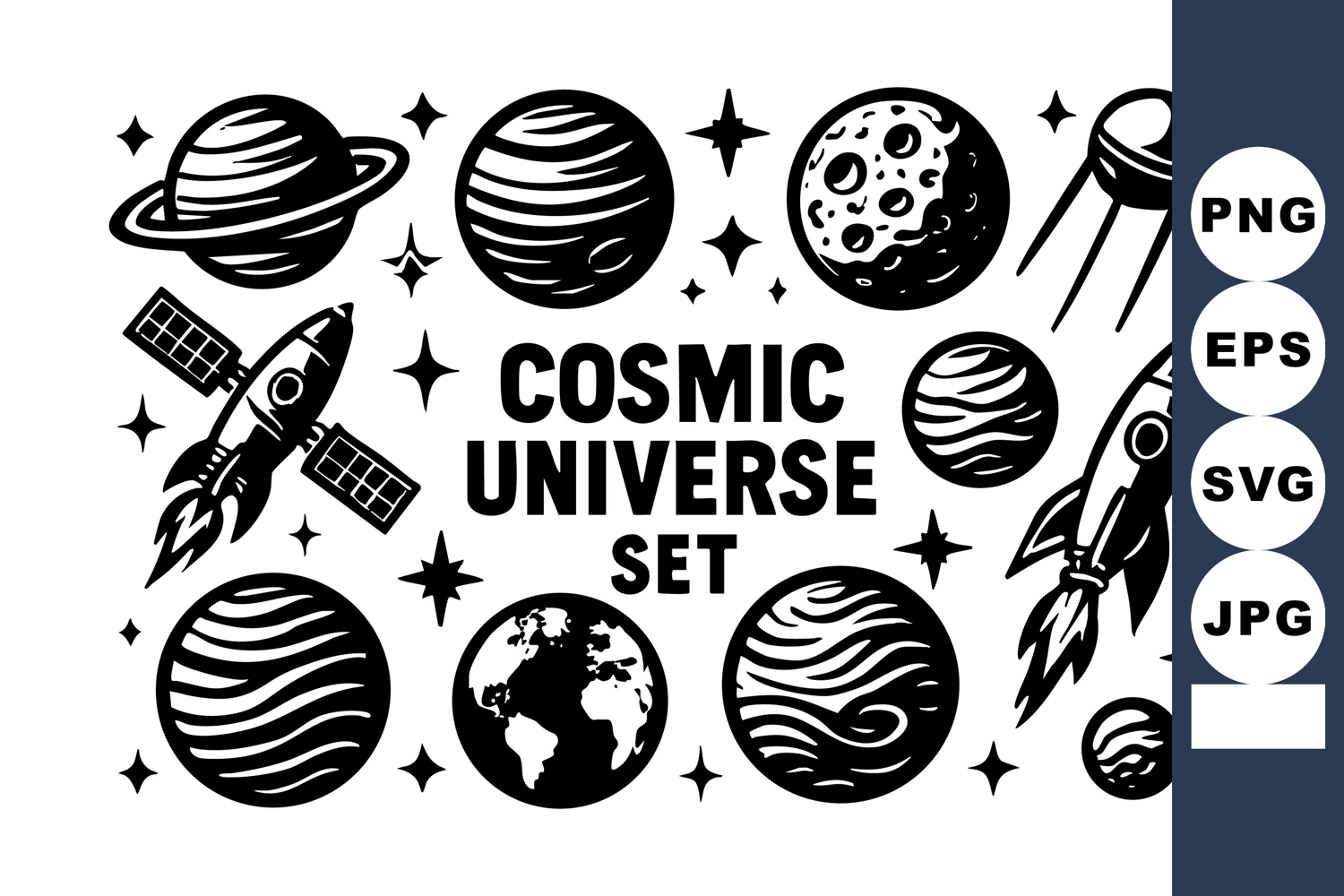 This vector features a cosmic universe set including rockets, planets, stars, satellite, and moon in black and white style presenting space exploration theme. Futuristic and adventurous mood.
