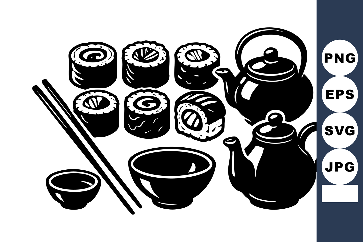 This black and white vector shows sushi rolls with chopsticks, teapots, and bowls, representing traditional Japanese cuisine and dining culture in a minimalist style. Calm and elegant.