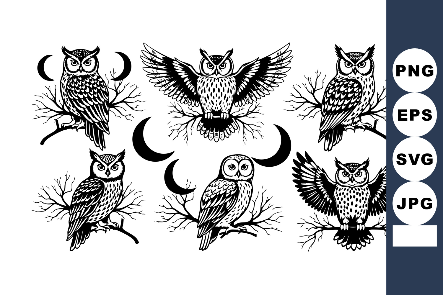 This vector features six majestic owls perched on bare branches with crescent moons in black and white style, presenting a nocturnal wildlife theme with intricate details and bold contrast. Calm.