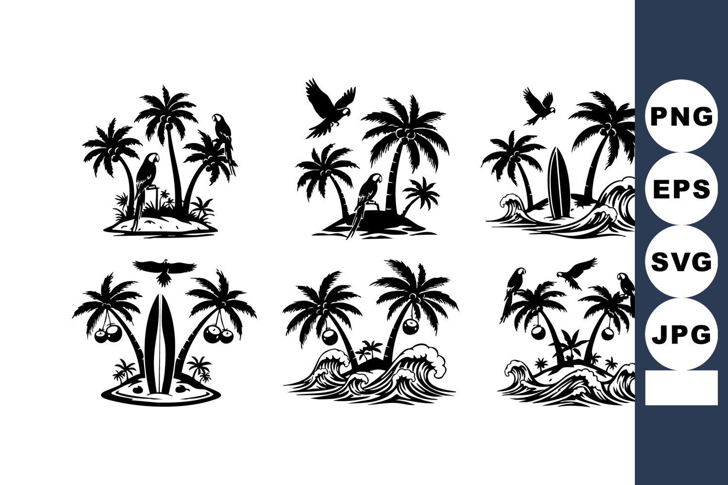 Vector collection of tropical island silhouettes featuring palm trees, birds, surfboards, and ocean waves. The design captures a beach vibe with natural elements, perfect for summer themes. Relaxed mood.