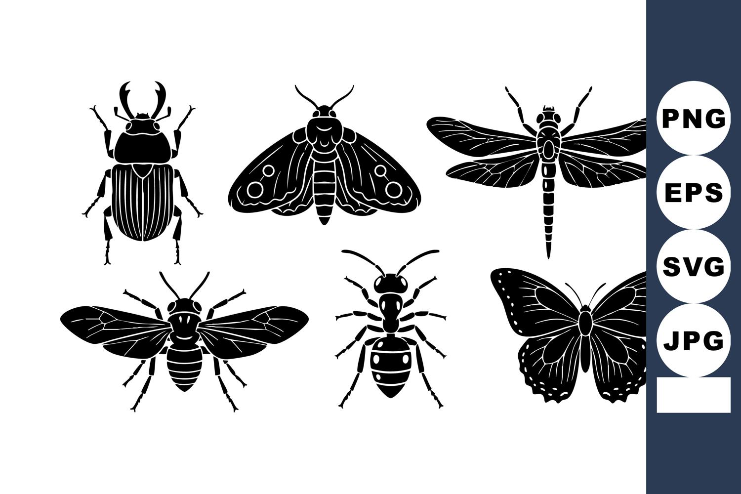 Six black silhouette insects including beetle moth dragonfly