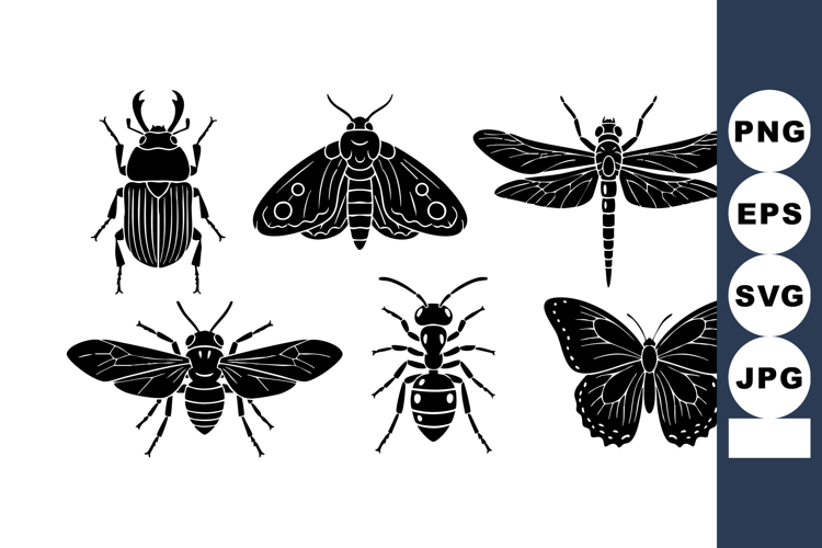 Vector design shows six black insect silhouettes including beetle, moth, dragonfly, bee, ant, and butterfly in a clean layout, representing nature and entomology in a minimalist style. Calm atmosphere.