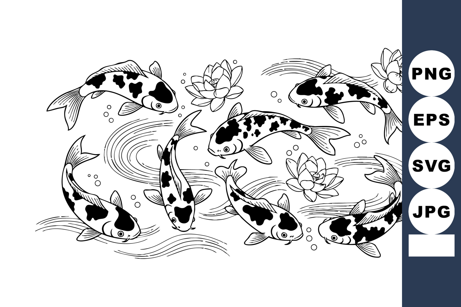 This vector illustration shows koi fish swimming gracefully in a pond surrounded by lotus flowers and water ripples, reflecting calmness and harmony in a traditional Japanese style. Serene mood.