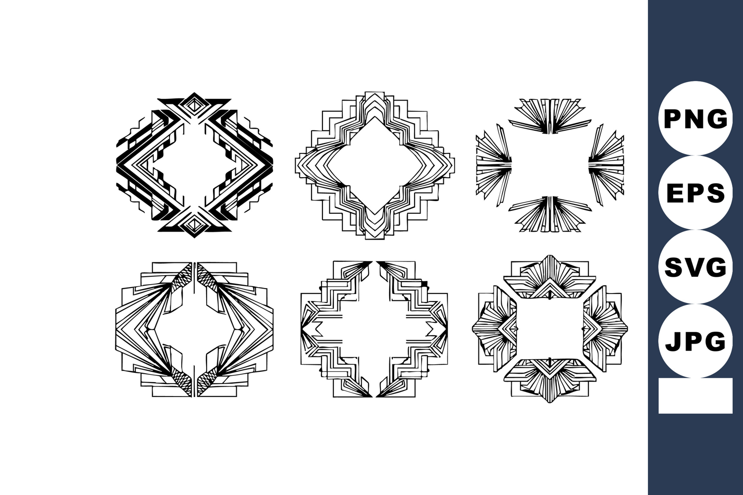 This vector file features six black ornamental geometric shapes with intricate artistic design elements, perfect for creative projects and decorative patterns, exhibiting a modern and elegant style.