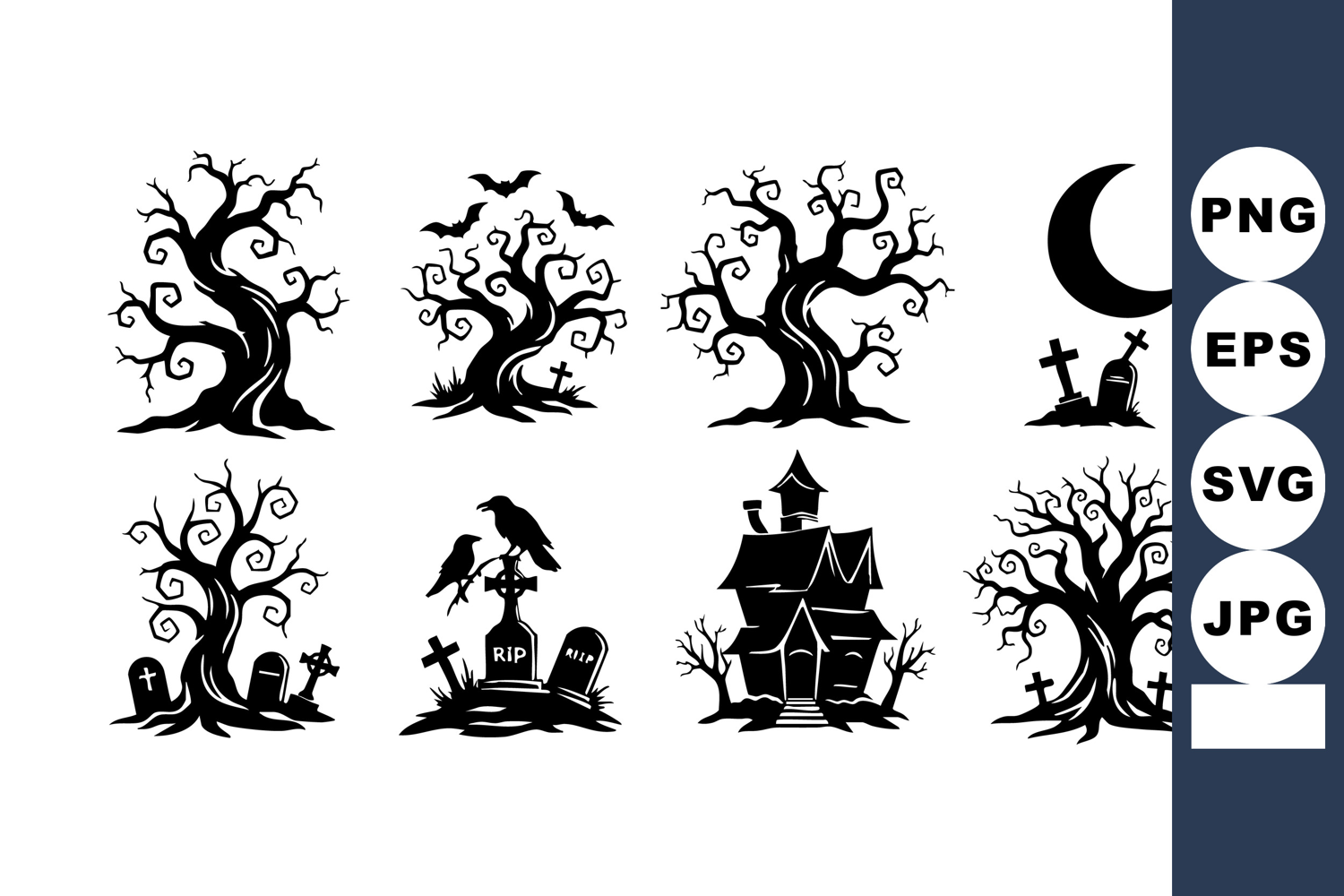 This vector set features spooky haunted trees, bats flying, a crescent moon, graveyard tombstones, and a haunted house silhouette, creating a dark Halloween atmosphere. Mysterious and eerie.