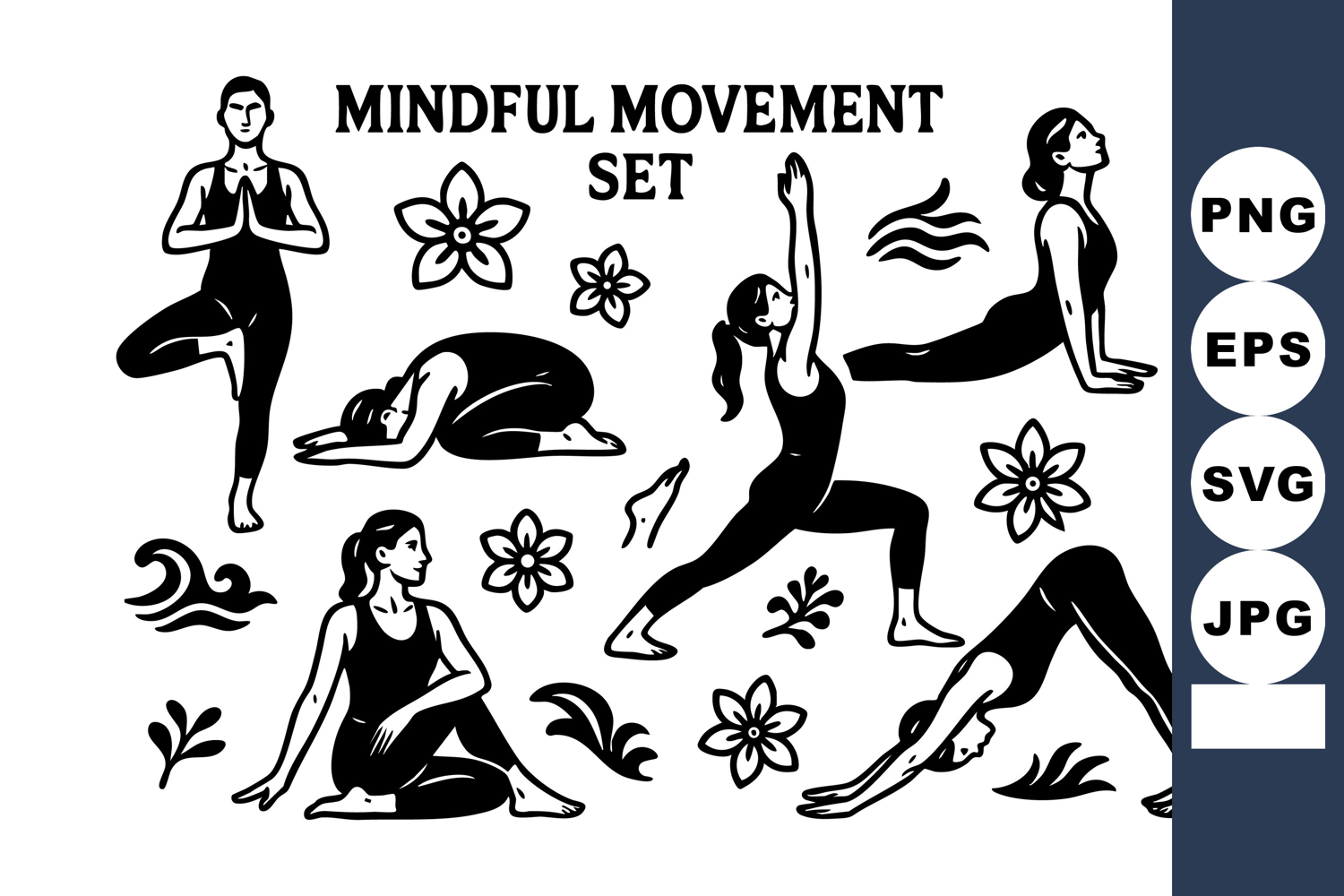 This vector features diverse mindful movement yoga poses with floral and wave accents, promoting calm, balance, and wellness through silhouette illustrations. Peaceful and serene mood.