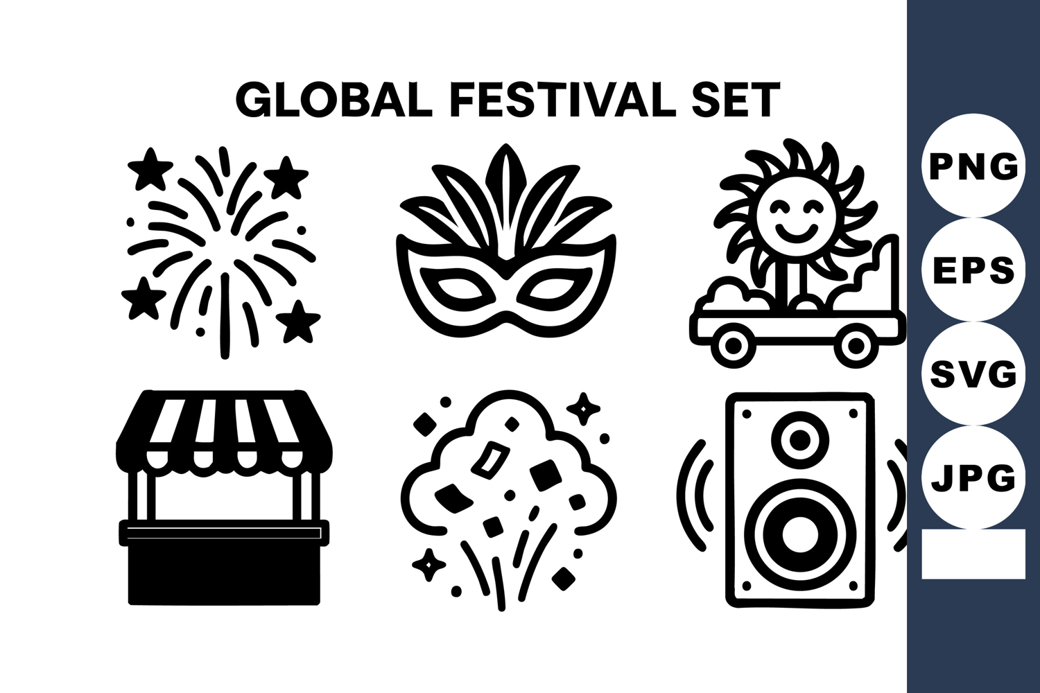 Vector shows a global festival including fireworks, mask, sun, party, market stall, and speaker icons representing celebration and fun, rendered in black silhouette style, lively mood.