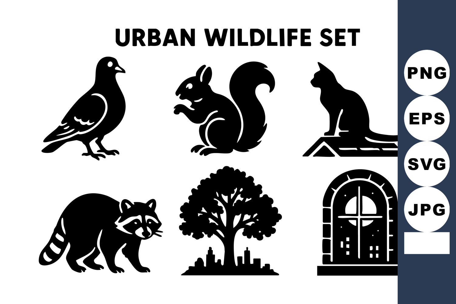 Vector shows urban wildlife including pigeon, squirrel, cat, raccoon, city tree, and window in black silhouettes. Clean, natural, minimalist, and modern style. Calm mood.