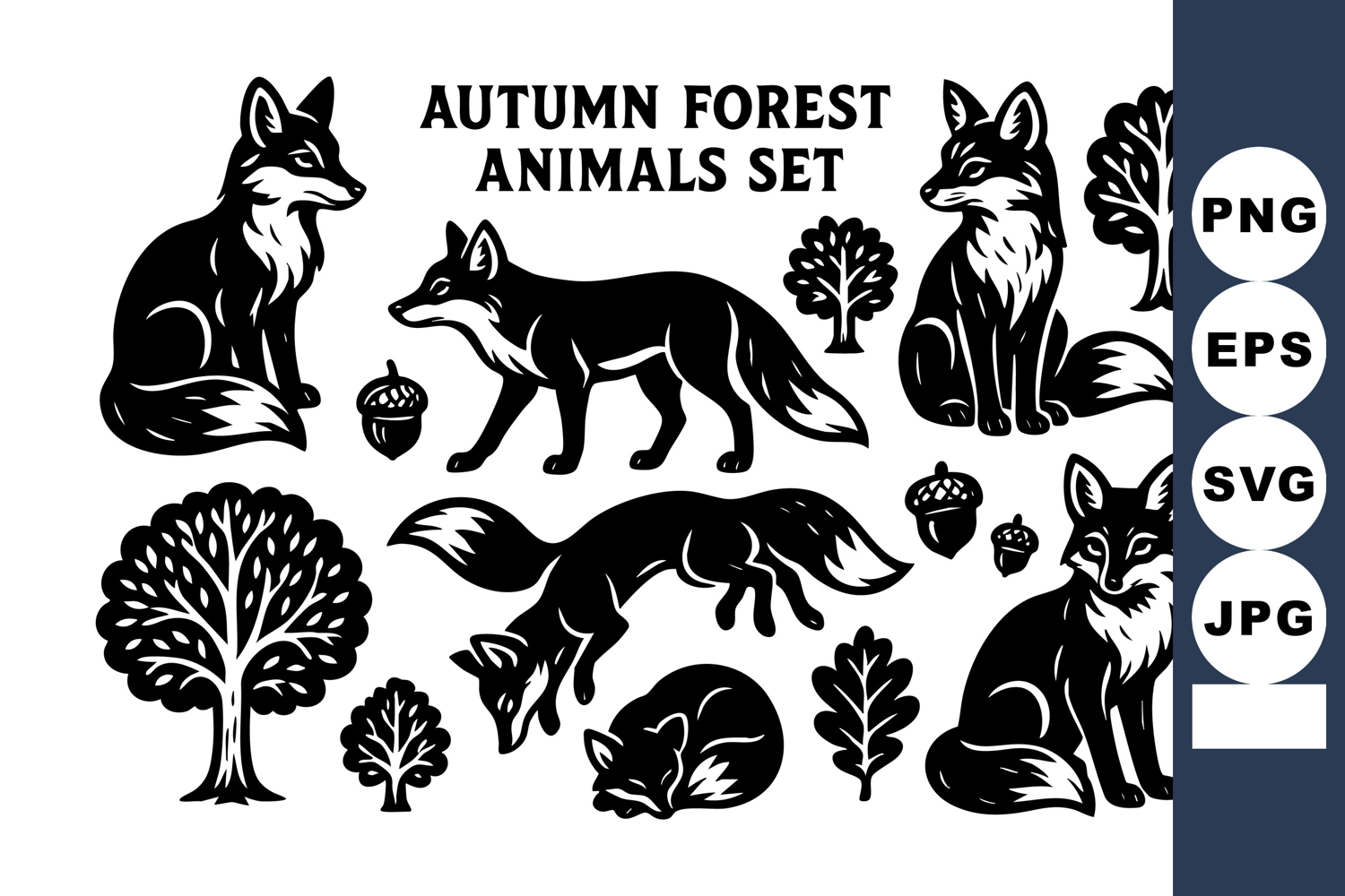 Autumn forest animals with foxes acorns and trees black sil example image 1