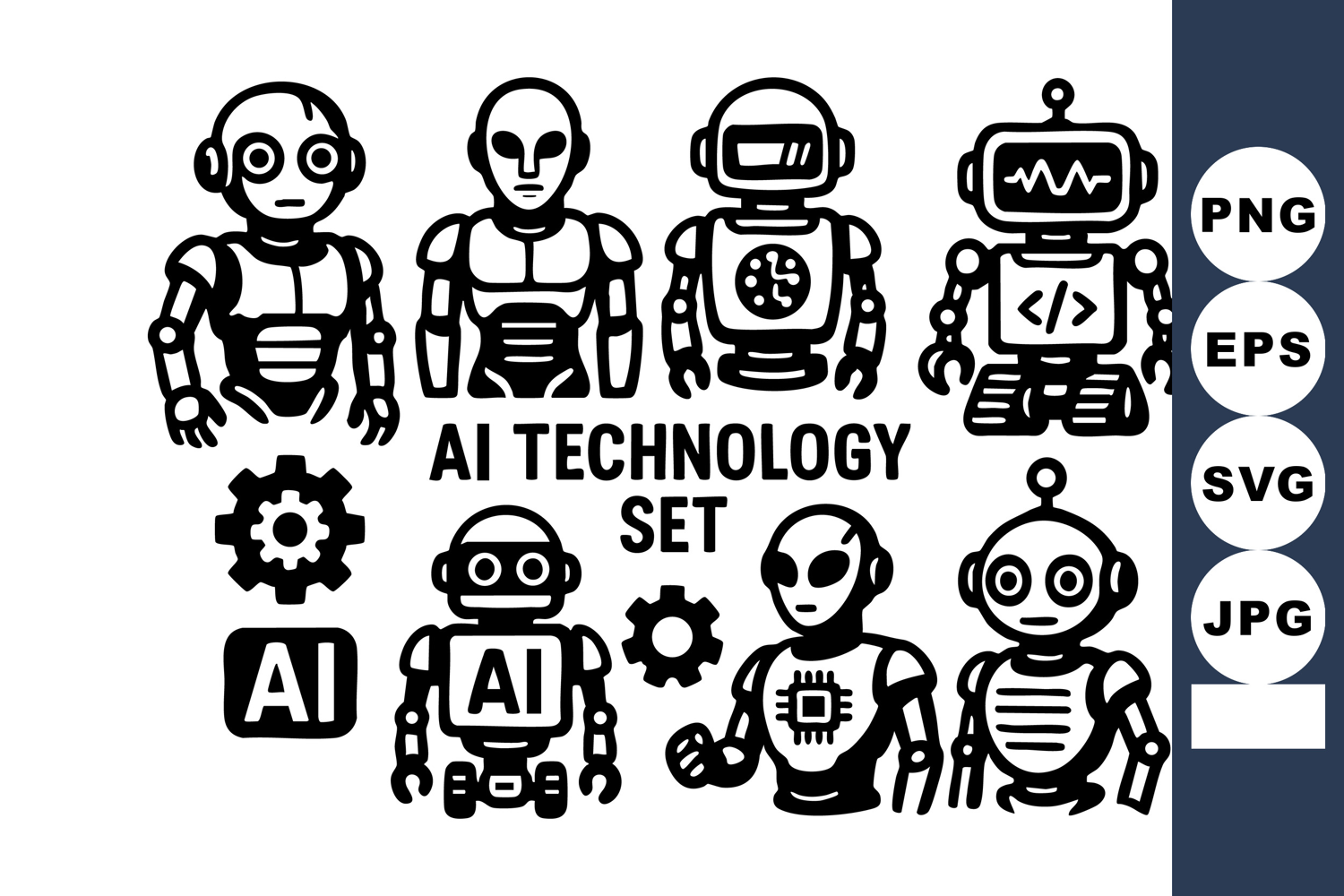 This vector features a of black and white AI technology robot icons with gears and circuits, illustrating futuristic cyborgs and artificial intelligence concepts in a clean style. Modern and tech-savvy.